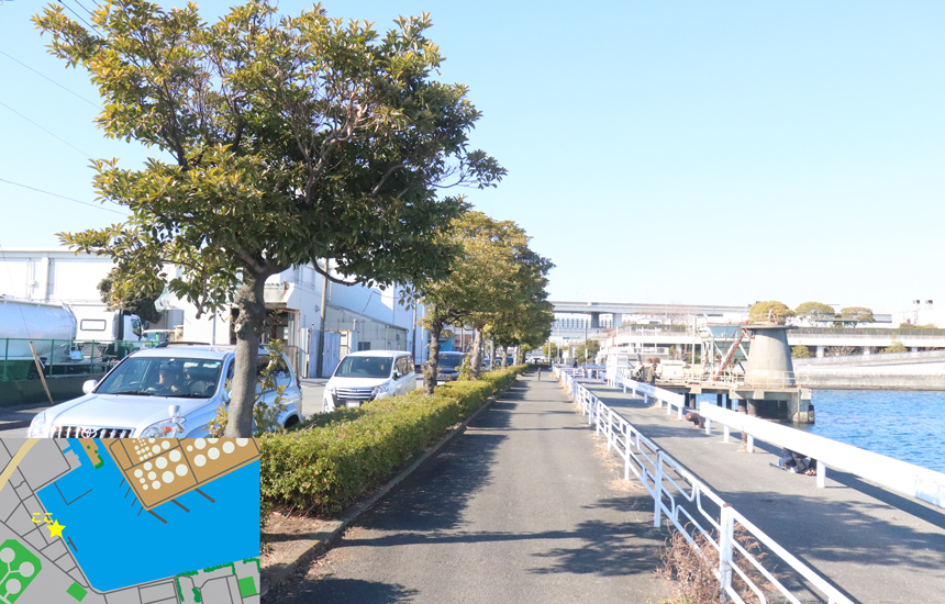 釣り場の全長は約1kmほどで、船の通りもほとんどない。釣り場には駐車場がないため、多くの釣り人は道路の脇に駐車している。